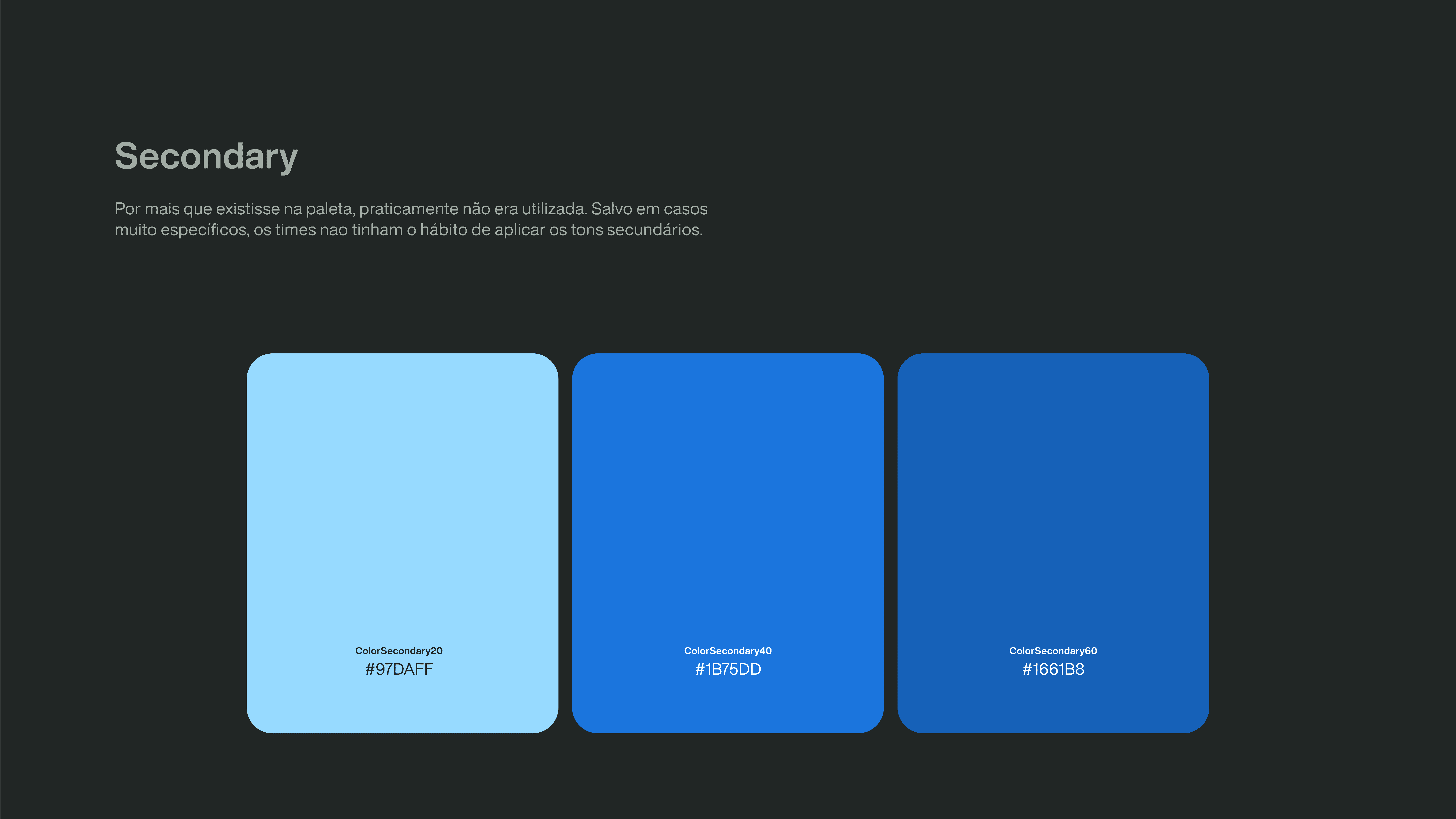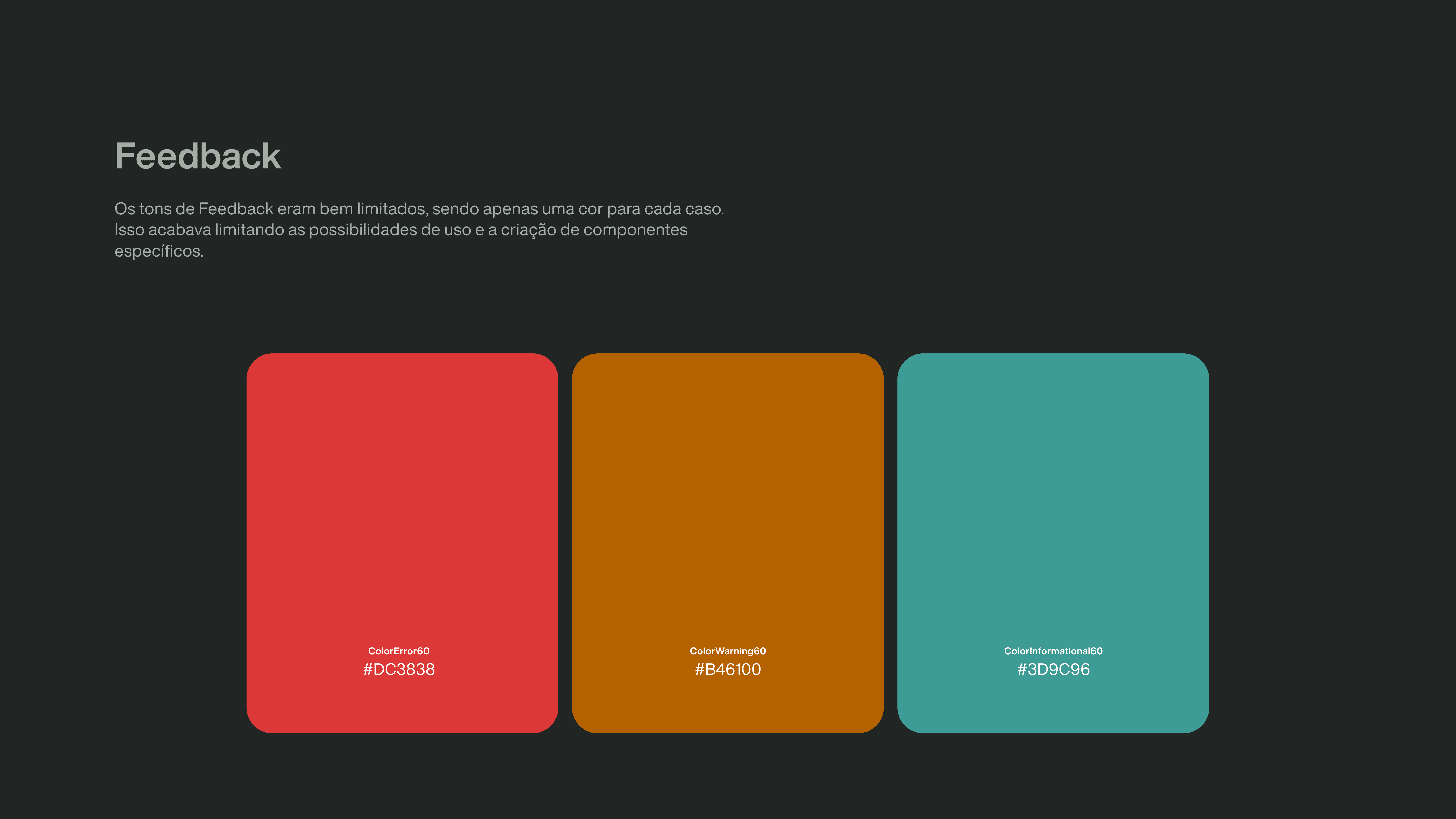 A paleta existente apresentava problemas estruturais de contraste, consistência e usabilidade. Tons neutros não seguiam um mesmo espectro, cores primárias possuíam pouco contraste entre si e as cores de feedback eram limitadas, restringindo possibilidades de aplicação.