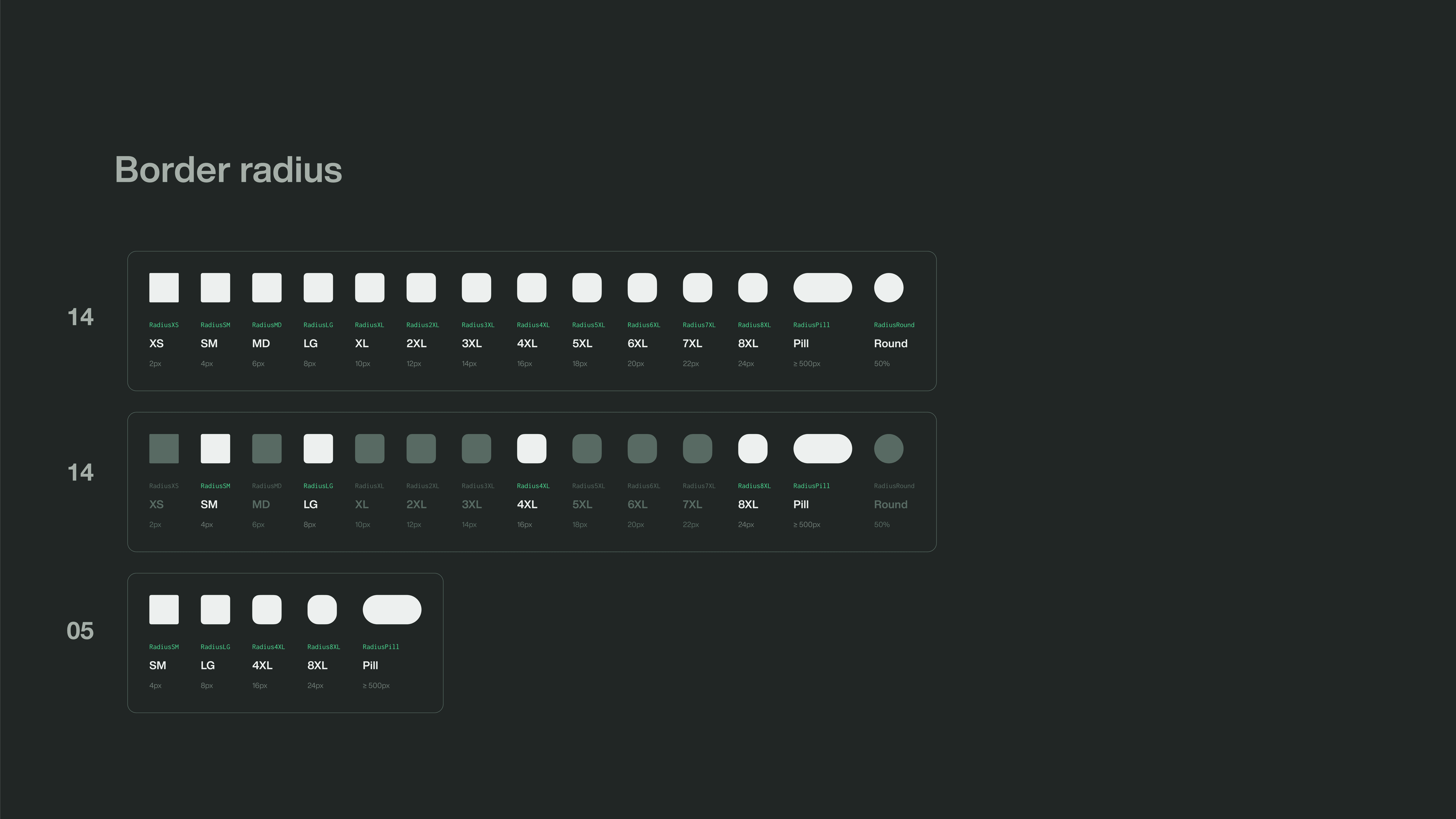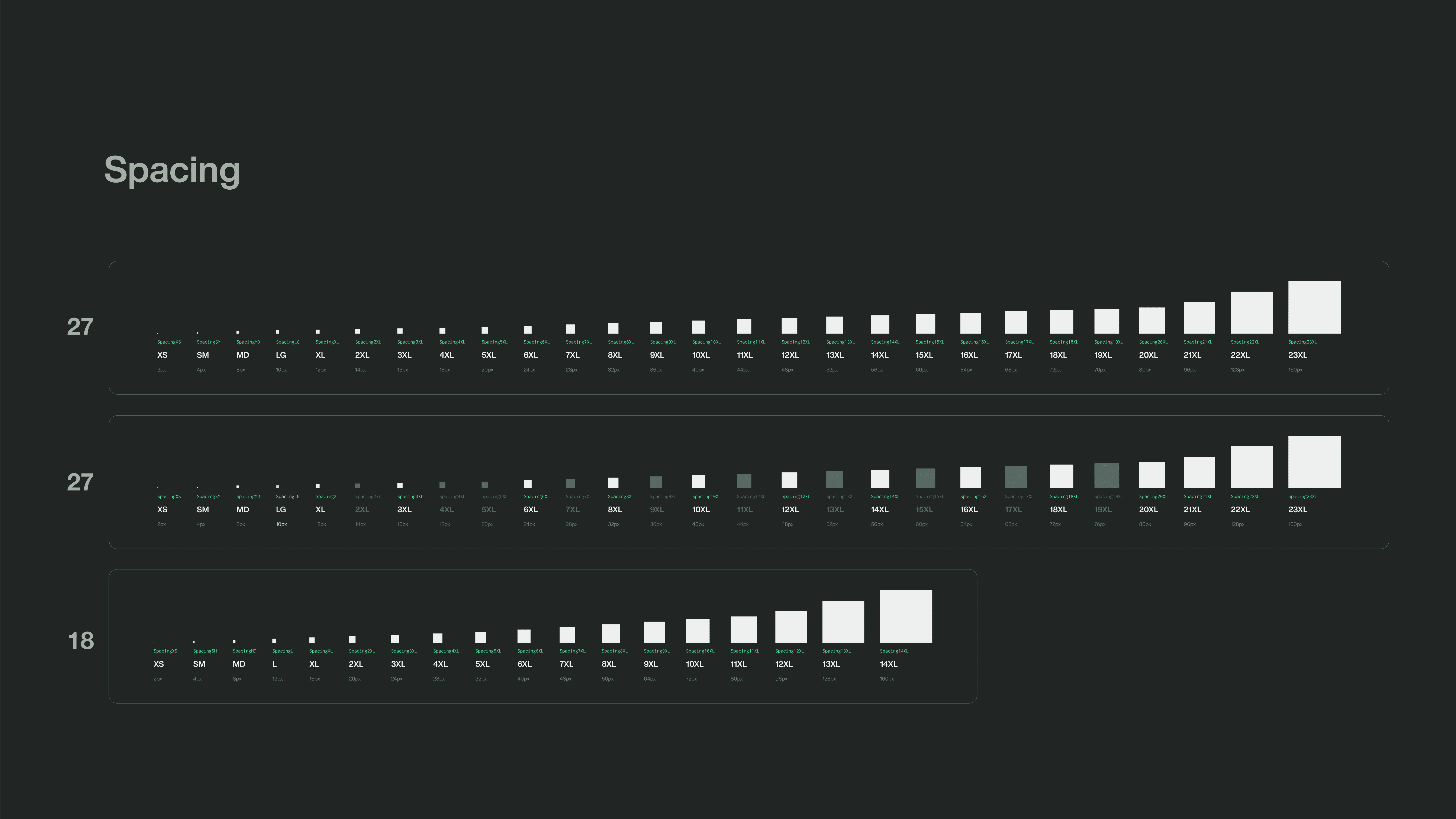 Outros fundamentos como spacing, border radius e tipografia também apresentavam excesso de variantes e ausência de critérios claros.
